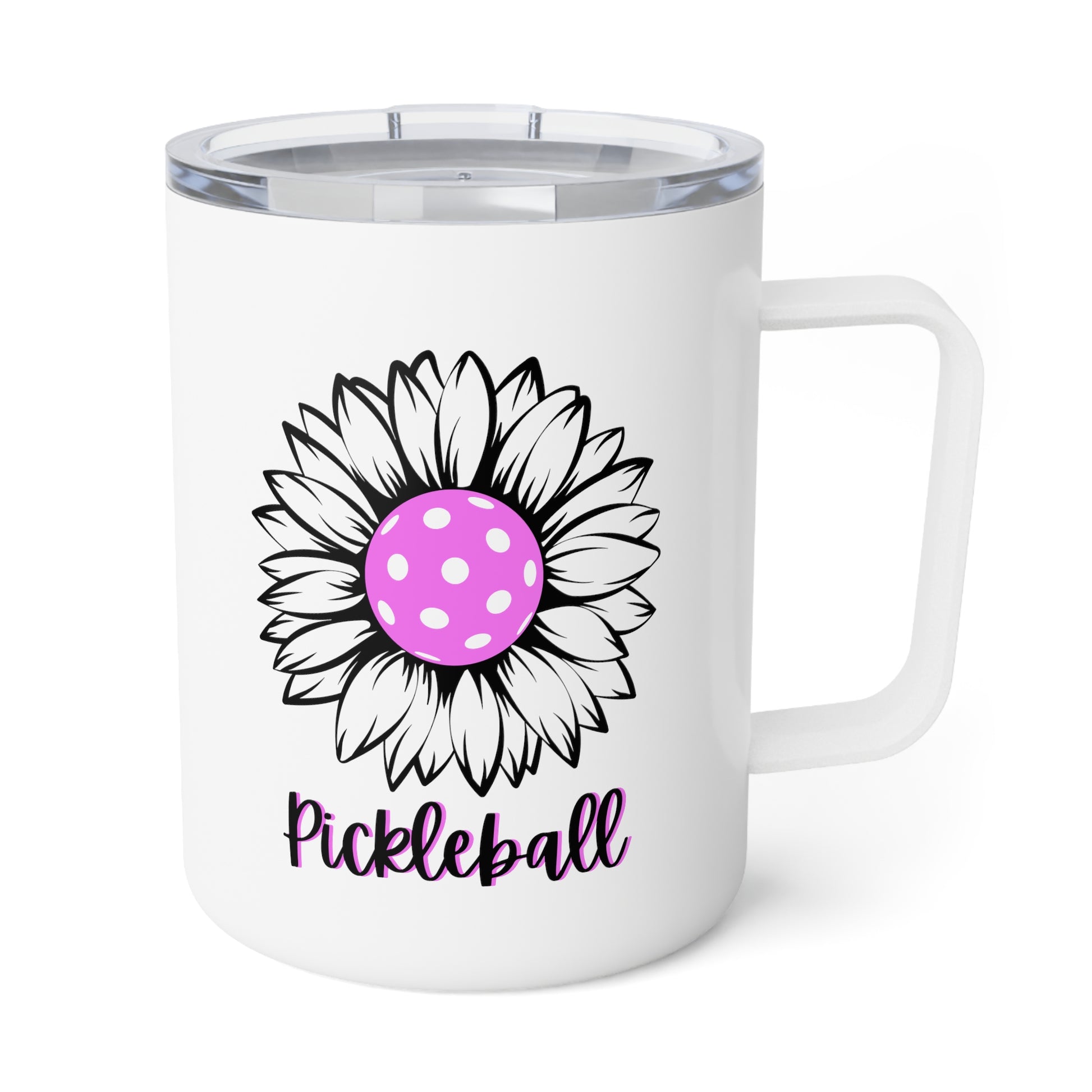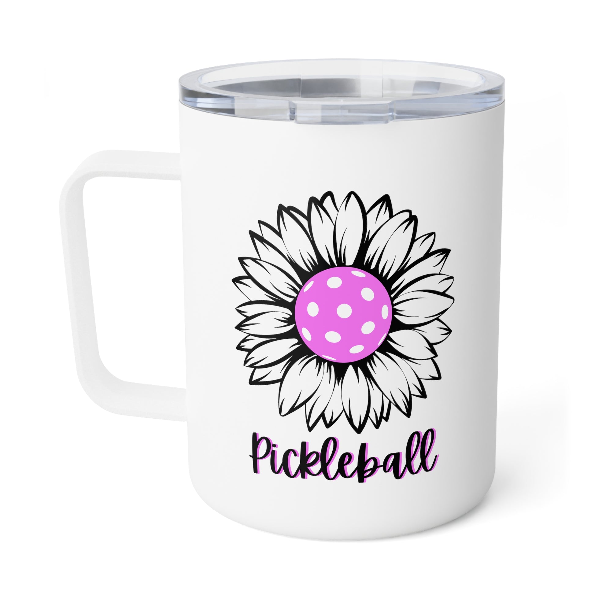 Keep your coffee or tea hot with the Pickleball Sun Flower Insulated Coffee Mug, featuring a 10oz capacity to get you through your longest games. Perfect for any pickleball enthusiast, this mug is also adorned with a sunflower design to brighten up your day. Stay caffeinated and stylish on the court.