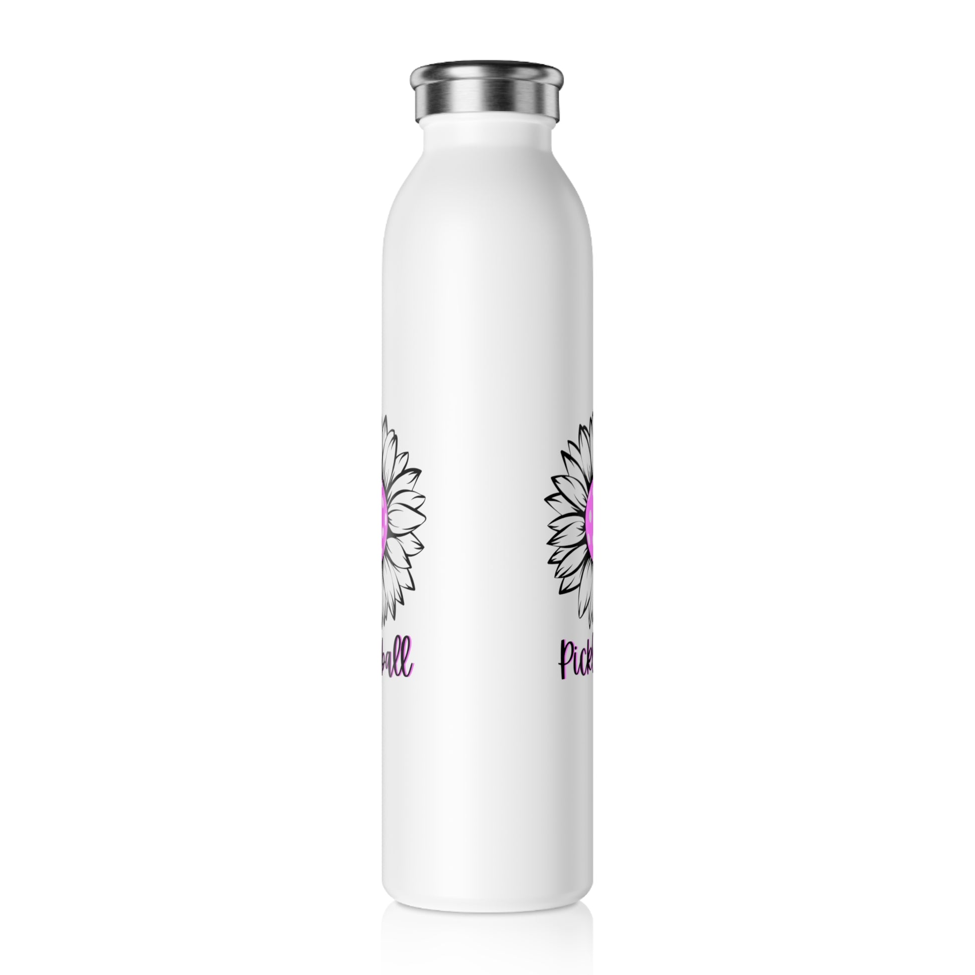 Introducing the Pickleball Sun Flower Slim Water Bottle. Made for Pickleball players on-the-go, this slim water bottle features a sunflower design and fits easily into bags and cup holders. Stay hydrated and stylish with this must-have accessory.